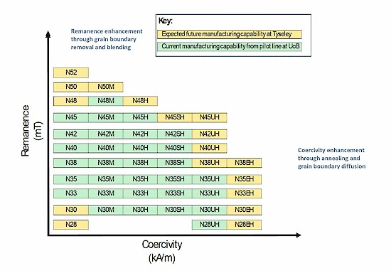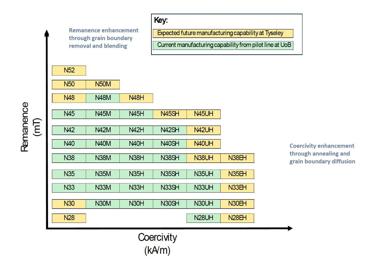 Through the abovementioned workstreams, together with further optimisation and development of blending and grain boundary technologies, HyProMag expects to significantly expand the range of commercial grades produced as illustrated below:
