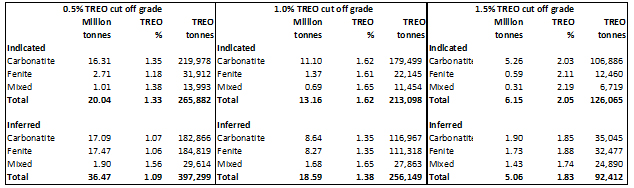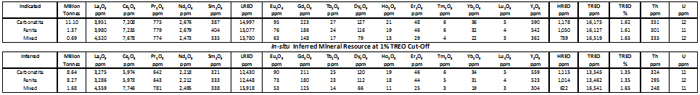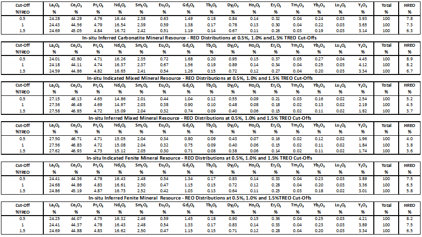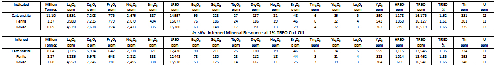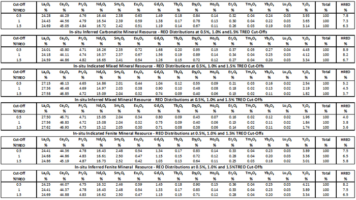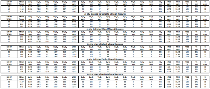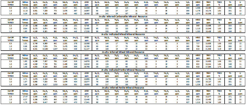 The in-situ mineral resource was independently prepared by The MSA Group of South Africa ("MSA"). MSA, in collaboration and agreement with Dr. Scott Swinden, the "Qualified Person" (QP), has currently identified 1.0% TREO as an appropriate cut-off grade for the mineral resource estimate. This will be further refined on completion of metallurgical test work. The In-situ mineral resource estimates at different cut-off grades are illustrated in Table 1 below.