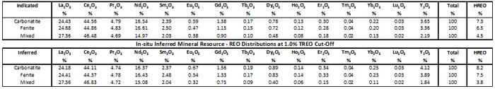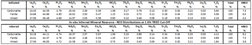 The individual REO data and ratios in Tables 2, 3, 4 and 5 were derived from length-weighted averages of the drill hole database. Heavy rare earths, as defined here, comprise europium, gadolinium, terbium, dysprosium, holmium, erbium, thulium, ytterbium, lutetium and yttrium. These include the most highly priced of the more commonly traded rare earths, europium, terbium and dysprosium.