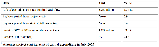 Subject to the Study-level Assumptions in the PFS, the key outputs from the financial model are as follows: