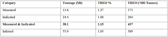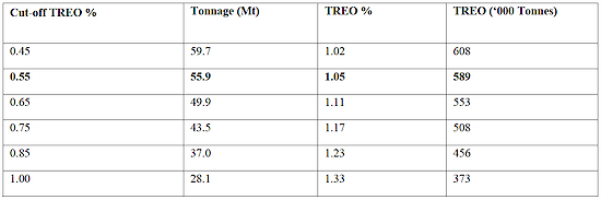The Mineral Resources are reported from within an optimised pit shell and above a 0.55% TREO grade, as summarised below.