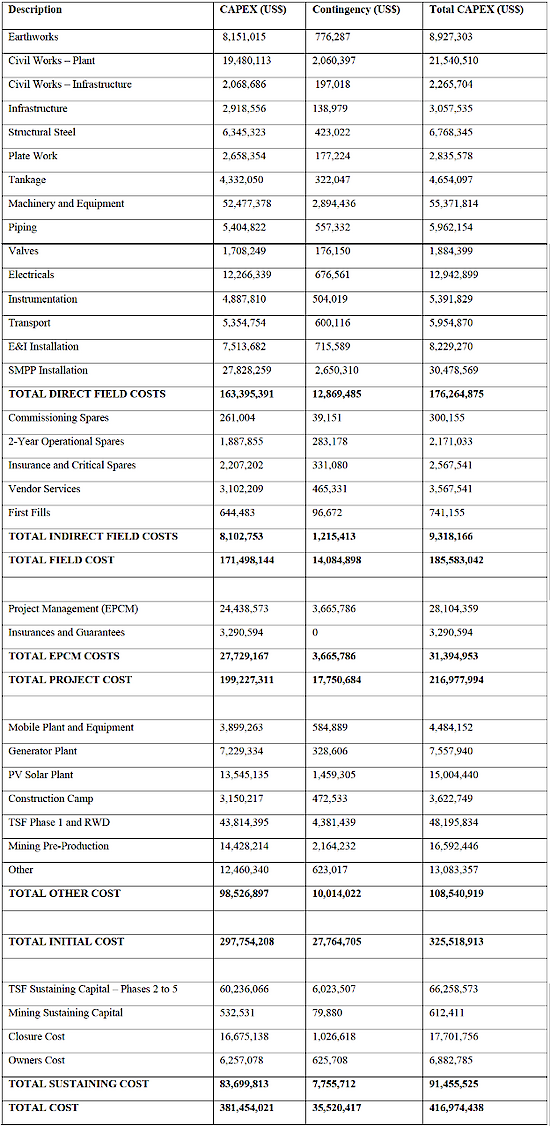 The estimate of initial capital expenditure costs was calculated to an accuracy of ±10% and was utilised in the economic analysis of the Project. The largest capex component is an integrated processing plant comprising a mill, flotation plant, hydrometallurgical plant, and a sulphuric acid plant with co-generated power capacity. The capex estimate for the integrated processing plant was completed by SENET and covers the design, engineering, procurement, supply/manufacture, construction and pre-commissioning of the proposed new processing facility and associated plant complex infrastructure including a 24.4 MW solar facility. Other major capex items include the cost of a lined tailings storage facility with design provided by Epoch.