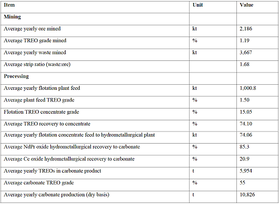 - Operating life of 18 years for Songwe, with production averaging 5,954 tonnes per year total rare earth oxides (“TREO”) for the first full five years of production, including 1,953 tonnes per year of neodymium and praseodymium oxides, and 56 tonnes per year of dysprosium and terbium oxides, in a MREC grading 55% TREO (dry basis).