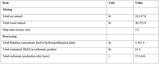 Songwe features broad zones of outcropping rare earth mineralisation on the northern slopes of a steep sided hill. The annual processing capacity is assumed to be approximately 1.0 million tonnes per year of ore producing an average of 5, 954 tonnes of TREO in MREC per year for the first five years and 4, 081 tonnes of TREO in MREC per year in years 6 to 18. The MREC will be cerium depleted.Because cerium is currently considered to have challenging market fundamentals, there is a strong economic rationale to remove as much cerium as possible and, as a result, a large proportion of the cerium will be removed from the MREC during the hydrometallurgical process. Confirmation of the flotation and hydrometallurgical processing flow sheets was underpinned by seven piloting campaigns at ALS Metallurgy and ANSTO.