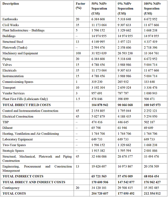 - Puławy initial plant capex of approximately US$212 million (including a US$35.4 million contingency) for development of a Rare Earth Separation plant and related project infrastructure in Poland.