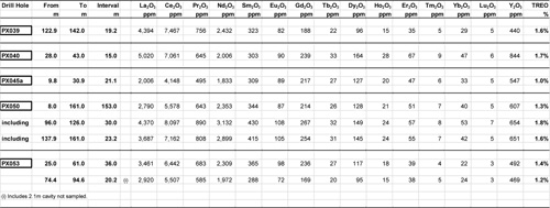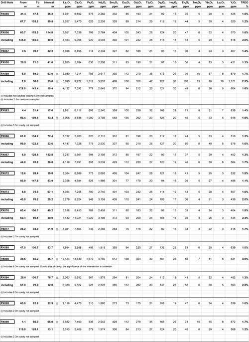 | PX059 | 63.0 m1 grading 1.7% TREO (6.0 - 69.0 m), including 23.0 m2 grading 2.3% TREO (7.0 - 30.0 m), and 15.4 m grading 1.6% TREO (128.0 - 143.4 m). Inclined hole (60 degrees west). |