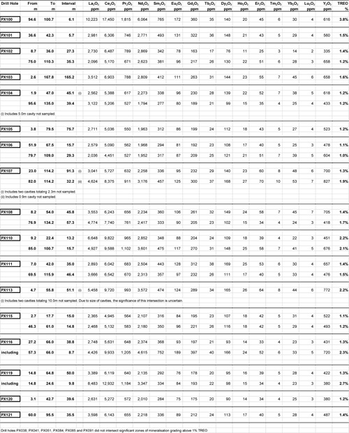 | PX107 | 91.3 m6 grading 1.3% TREO (23.0 - 114.2 m) including 32.2 m7 grading 1.9% TREO (82.0 - 114.2 m). Inclined hole (60 degrees east). |