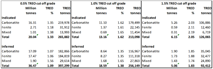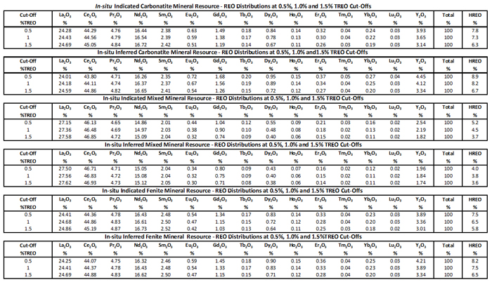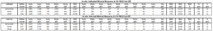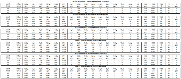 The Report was independently prepared by The MSA Group of South Africa ("MSA") and Dr. Scott Swinden of Swinden Geoscience Consultants Ltd, the "Qualified Person" (QP), who together have currently identifed 1.0% TREO as an appropriate base case cut-off grade for the mineral resource estimate. This will be further investigated on completion of metallurgical test work. The In-situ mineral resource estimates at different cut-off grades are illustrated in Table 1.