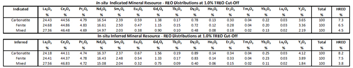 The overall weighted average proportion of heavy rare earths as a percentage of total rare earths for Indicated and Inferred resource estimates at 1.0% TREO cut-off grade is 7.1% and 7.4% respectively. The heavy rare earths vary with cut-off grade both in terms of absolute values and relative proportions. As TREO grade decreases, relative proportions of heavy rare earths increases (at 0.5% TREO cut-off grade, the HREO proportion is 7.7% and 8.2% for Indicated and Inferred categories, respectively) and the reverse is also true (at 1.5% TREO cut-off grade, the HREO proportion is 6.1% and 5.8% for Indicated and Inferred categories, respectively).