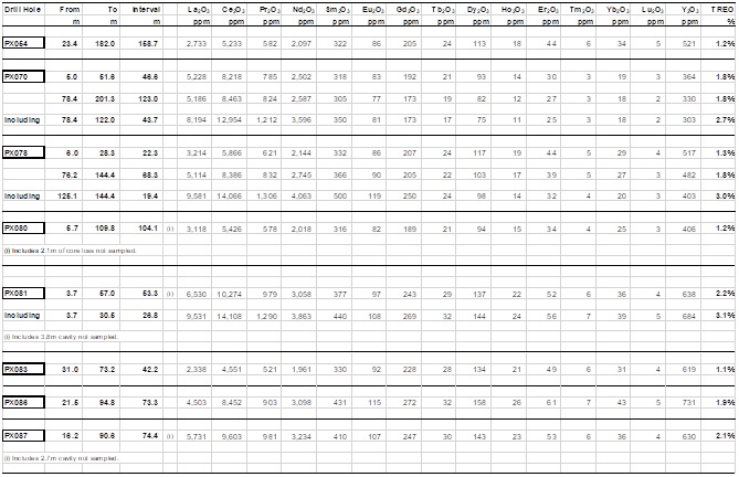 | PX093 | 83.9 m grading 1.9% TREO (1.5 -- 85.4 m) including 18.0 m grading 3.0% TREO (21.0 -- 39.0 m). Inclined hole (60 degrees west). |