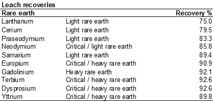 - Good leach recoveries - overall rare earth recoveries are greater than 80% with recovery of critical rare earths (CREO)1 to the leach solution ranging from 86% to 93%