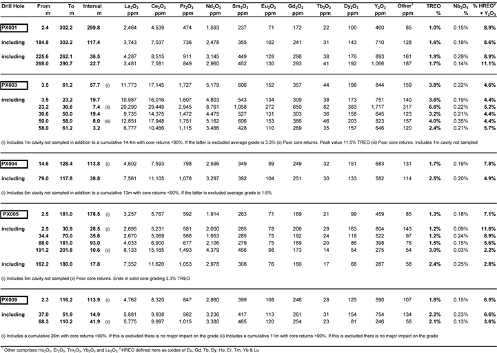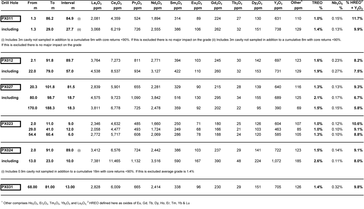 | PX031 | 13.0m grading 1.4% TREO (68.0 - 81.0m). Between 81.0m and the end of hole at 136.2m, PX031 intersected zones of broken ground grading up to 5.6% TREO. This zone will be further tested in a subsequent phase of drilling. PX031 ended in mineralisation. |