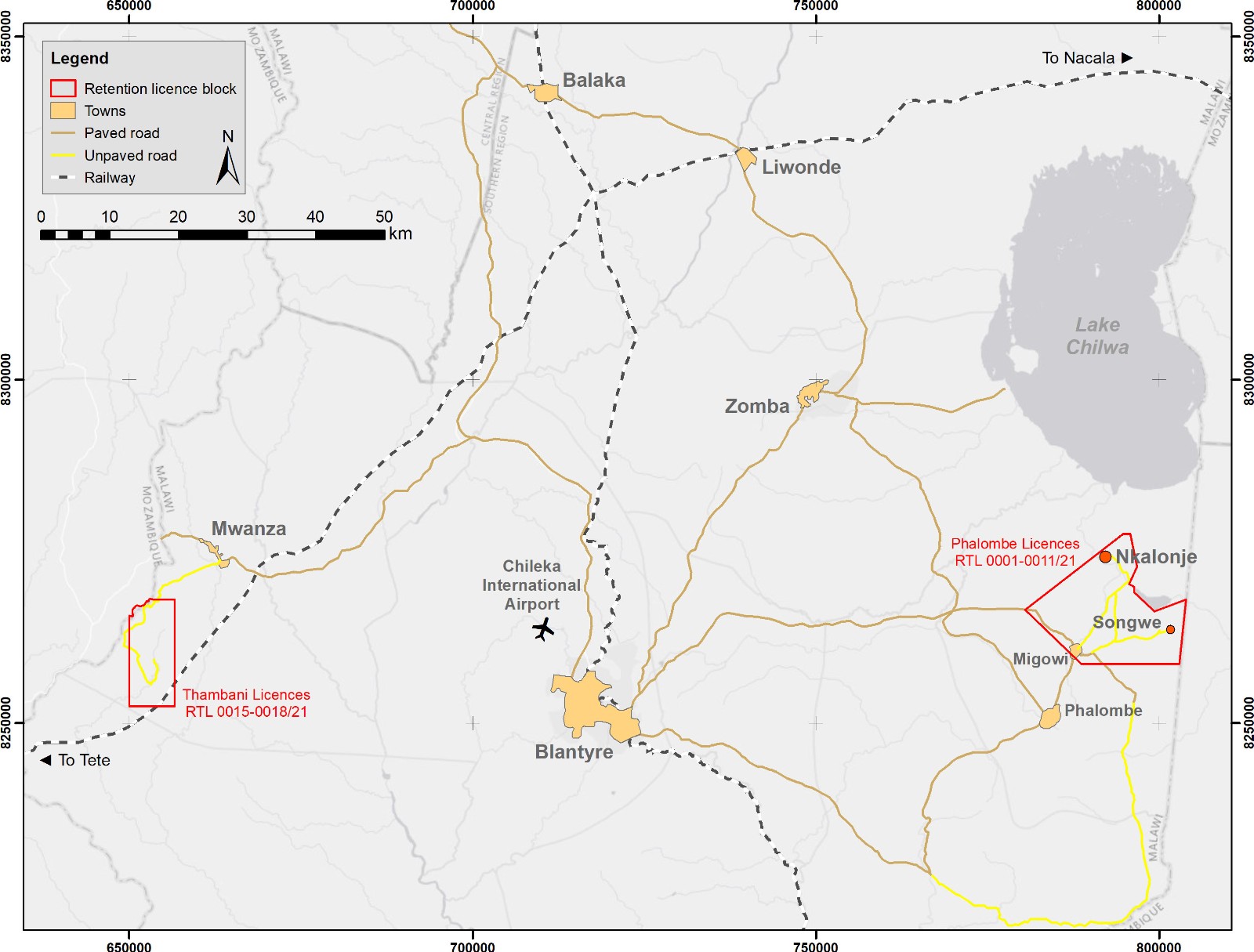 Nkalonje Hill is located in southeastern Malawi, south of Lake Chilwa, approximately 95 km by road from the commercial capital of Blantyre, which has an international airport and a railhead (Figure 1). Paved roads run from Blantyre to within 19 km of Nkalonje.
