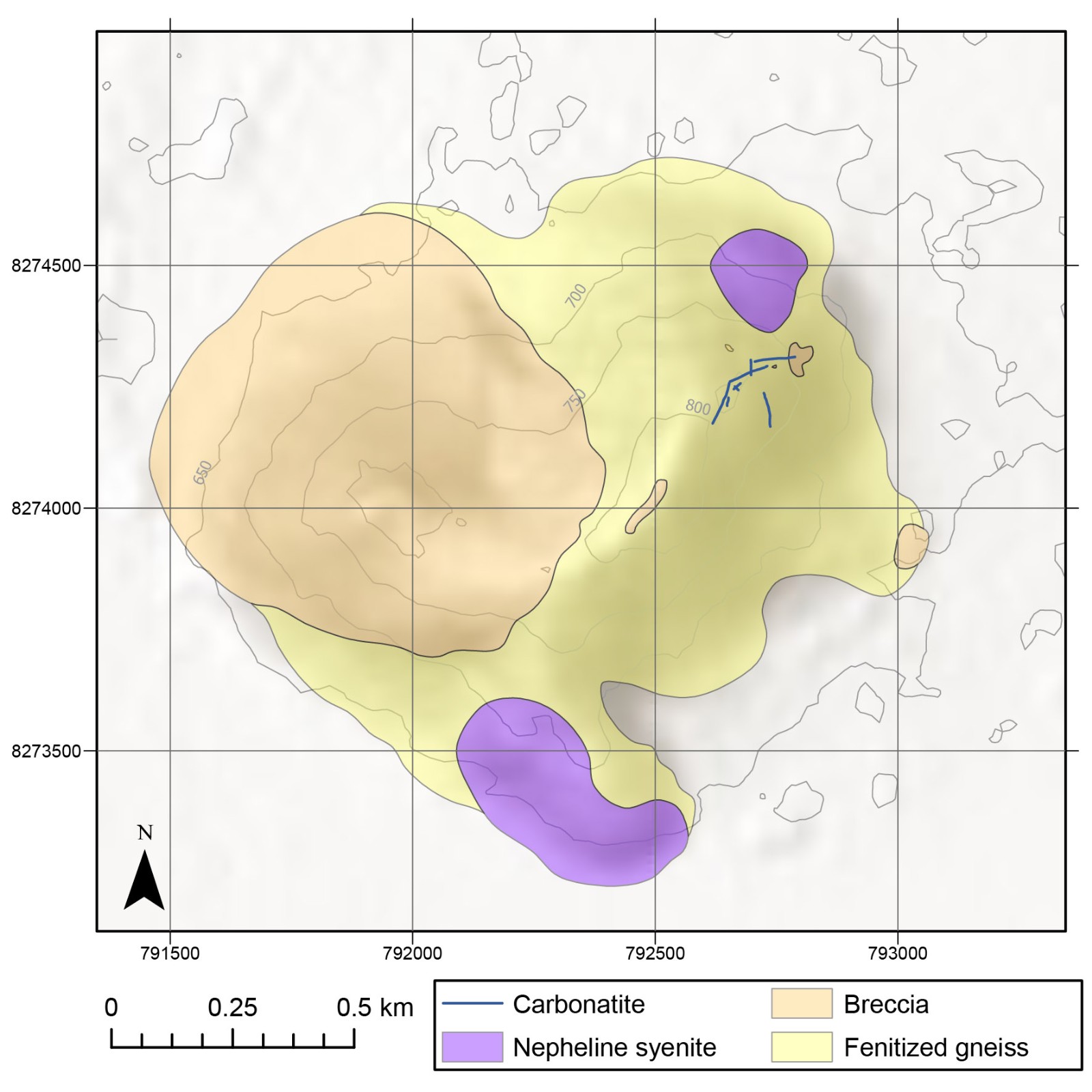 Nkalonje Hill is underlain by an alkali silicate–carbonatite intrusive complex geologically similar to Songwe Hill, comprising two connected peaks (Nkalonje and Nyama) underlain by fenite, nepheline syenite and breccia (Figure 2). The fenites on Nkalonje Hill are intruded by carbonatite veins and dykes that are locally enriched in rare earth elements (REE), suggesting potential for a larger mineralised carbonatite body below surface. The breccia body is approximately 900 m in diameter and comparable in lateral extent to Songwe Hill. Mapping to date has identified eight carbonatite dykes reaching 4 m in width and traceable at surface up to 90 m along strike.