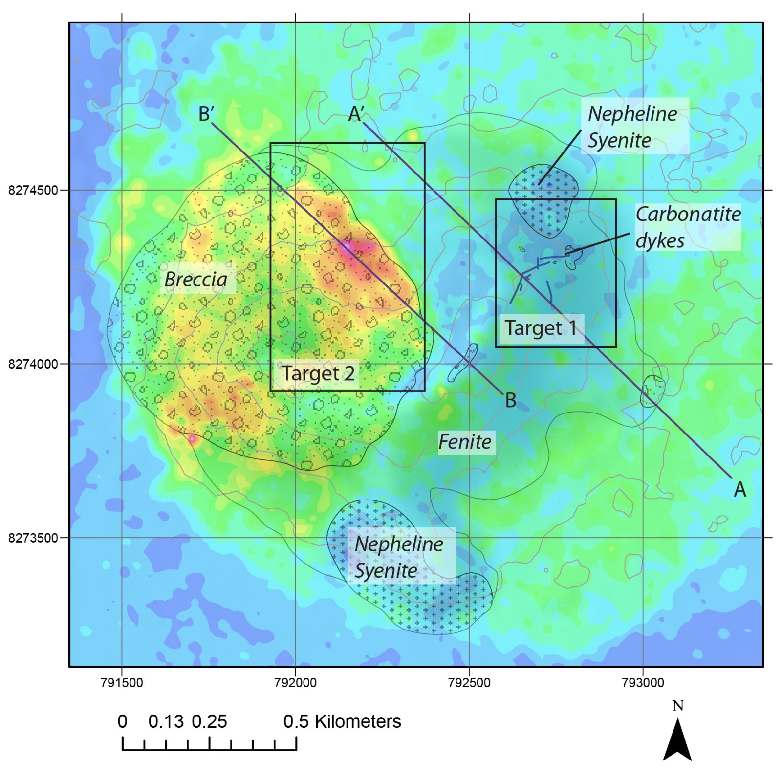 The ground geophysics data support the geological interpretation of a ring complex structure, as seen at Songwe, and at other carbonatite vents in Malawi. The overall diameter of this structure is approximately 1.7 km and comprises an outer ring of nepheline syenite and a central vent of breccia. The geophysical characteristics of the central breccia vent include a low magnetic response, low density and high conductivity. However, it also includes a central gravity anomaly extending from the surface to approximately 300 m depth. This feature is preliminarily interpreted as a shallow body of carbonatite, which fits the observed lithologies present at Nkalonje, and the conceptual structure of the hill.