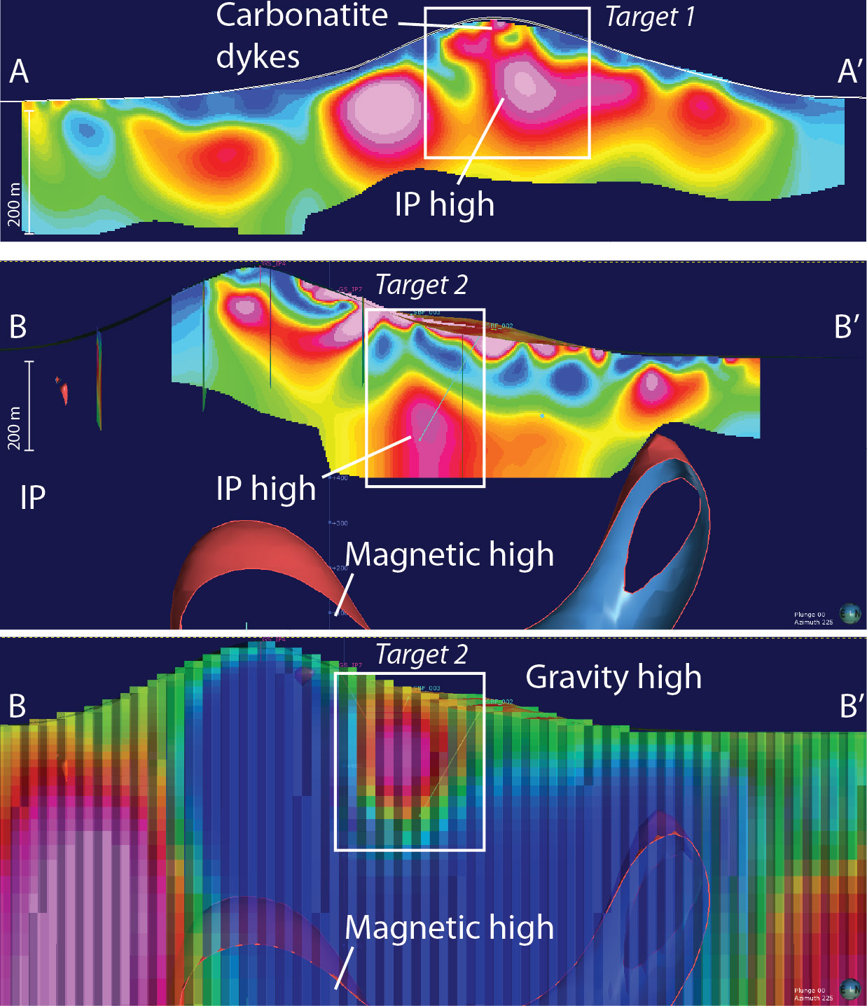 Target 2 is a conceptual target based on geophysical anomalies which consist of a surface radiometric anomaly (high Th), a gravity high and magnetitic low, with an IP anomaly at depth (Figures 3 and 4). The target is in a relatively eroded, poorly exposed part of the hill. These geophysical and geomorphological features fit with a conceptual model of a central carbonatite body, common to other carbonatite complexes, which the surface dykes suggest may potentially contain REE mineralisation.