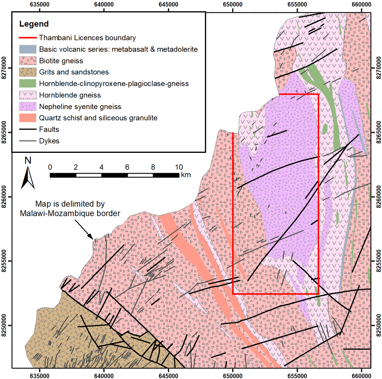 The geology of the Thambani area is dominated by paragneisses of the basement complex (Mozambique Belt of southern Malawi) with only the extreme south-west of the licence crossing the Mwanza Fault into the Palaeozoic Karoo sediments. The majority of the licence area is underlain by metasediments, mostly biotite gneiss, in which the gneissose fabric trends NW-SE in the southern part of the licence and rotates to NNW-SSE in the north-west quadrant of the licence area.