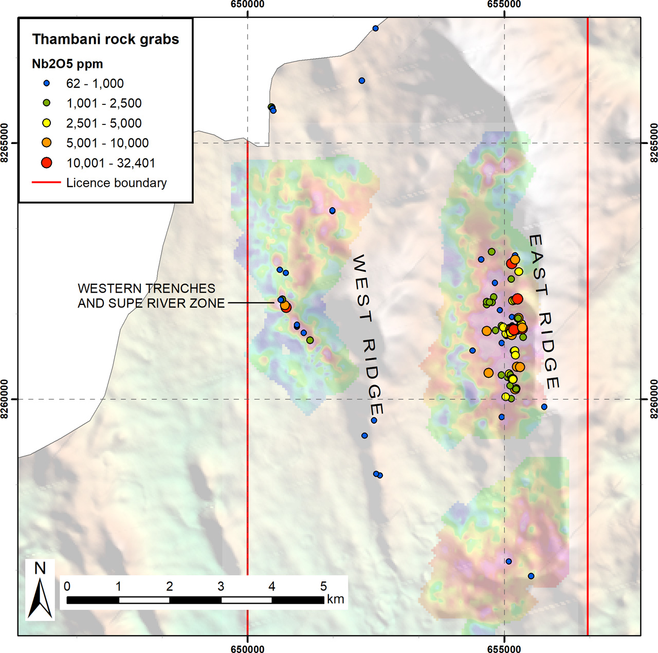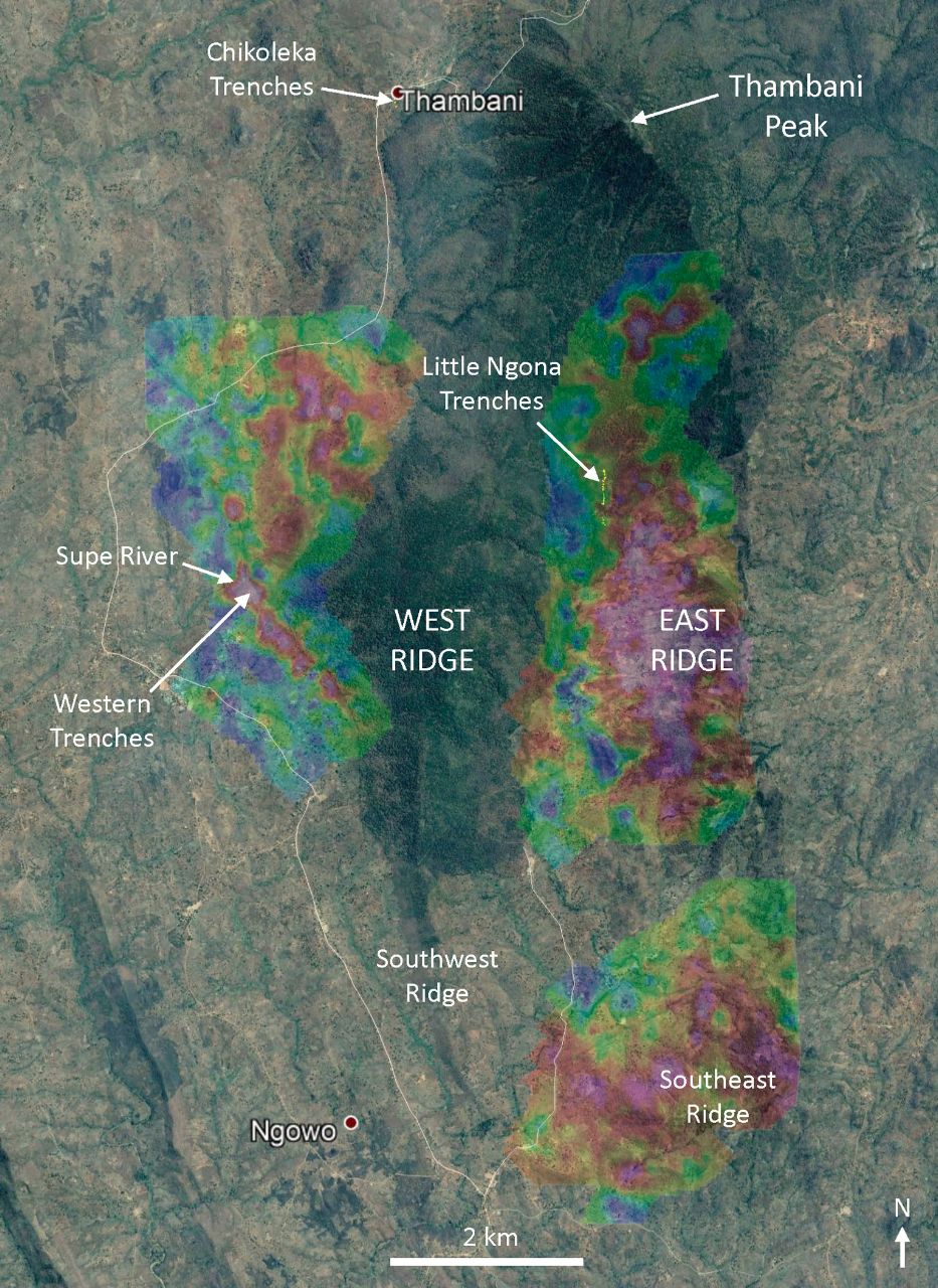 In 2013, Mkango completed a sampling programme across the Thambani Massif primarily focused on two sites of historical uranium exploration, known as the Chikoleka and Little Ngona targets. An initial set of 9 historical trenches, selected on the basis of anomalous ground radiometric measurements, were cleaned, re-examined and sampled across profiles from soil/overburden into bedrock. Some outcrop was also sampled on the East Ridge.
