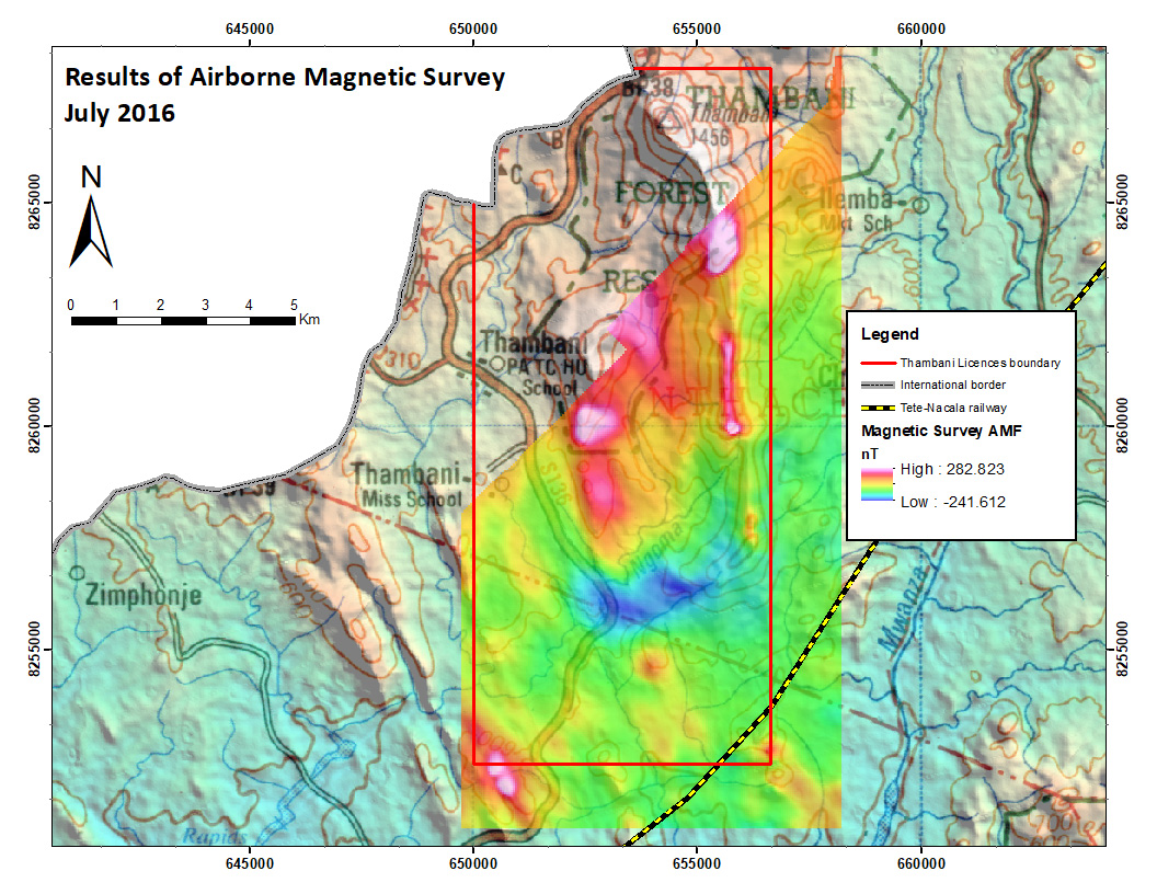 In 1984 and 1985 the Geological Survey Department of Malawi (GSDM) compiled and published total field aeromagnetic survey data at 1:250,000, 1:100,000 and 1:50,000 scales covering the whole of Malawi. The data were acquired by Hunting Geology and Geophysics Ltd (“Hunting”) under contract to the United Nations (Project MLW/ 80/030) (Hunting Geology & Geophysics Limited, 1985). The data were obtained, dependent on the terrain, from fixed wing and helicopter aeromagnetic surveys flown with a flight line spacing of 1,000m at mean sensor elevations of 120m and 50m, respectively. The data were corrected for diurnal variations and gridded at a cell size of 250m prior to contouring for the paper-based maps. Topographic information was reproduced from the 1:50,000 scale map series published by the Government of Malawi using a Universal Transverse Mercator (“UTM”) coordinate grid.