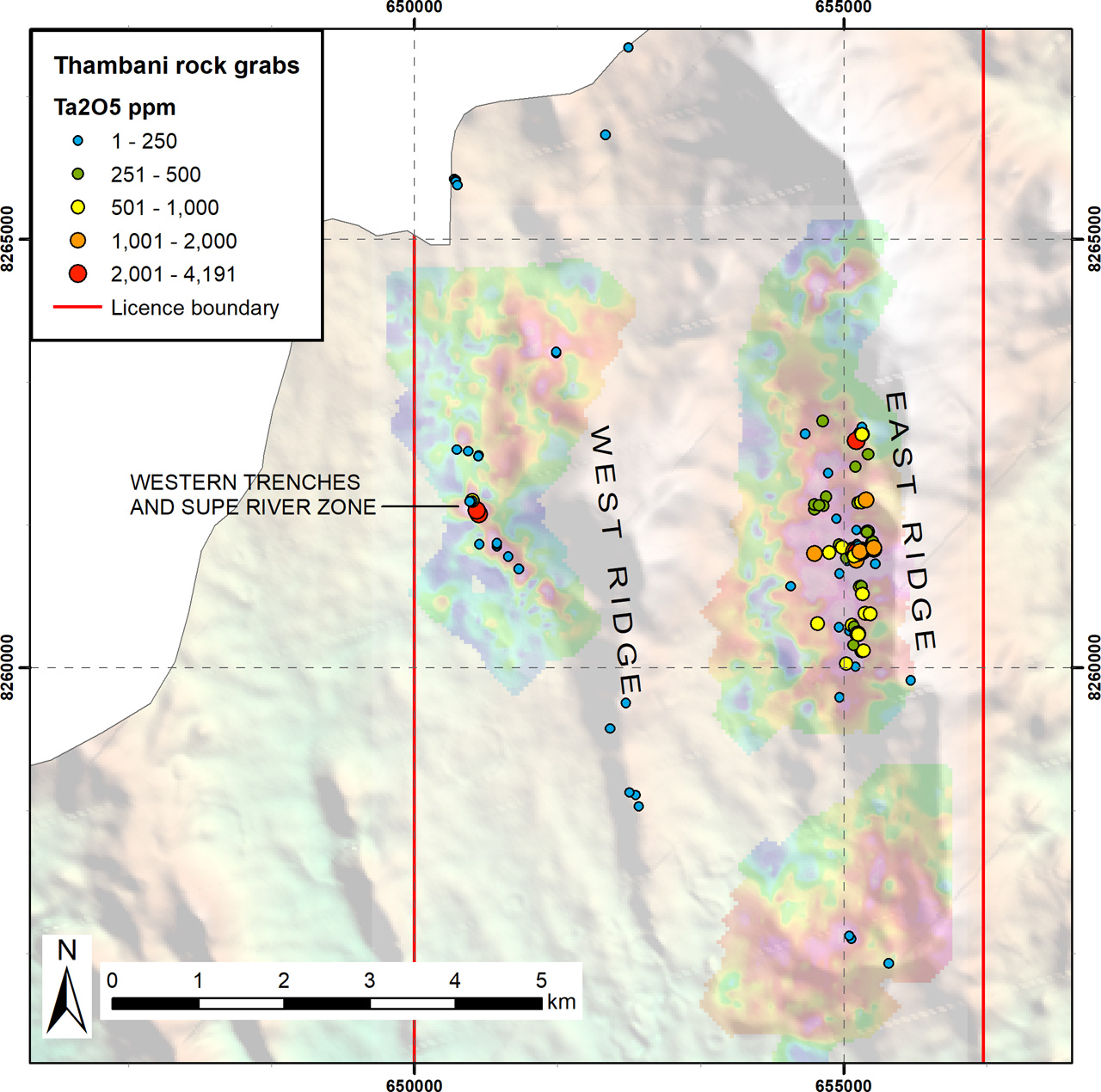 Exploration by Mkango at Thambani has provided new information on the nature, disposition and grade ranges of mineralisation in the Thambani Massif. Sampling of mainly fresh samples on the East Ridge indicates that the U-Ta-Nb mineralisation occurs within the gneissic bands, and surface observations indicate that it may occur in conformable zones. This provides a target for shallow drilling on the down-dip extension of the surface showings.