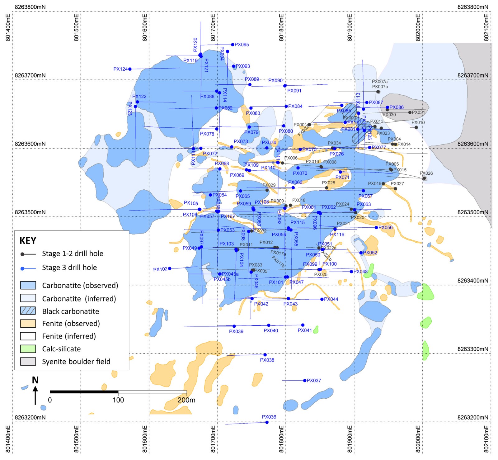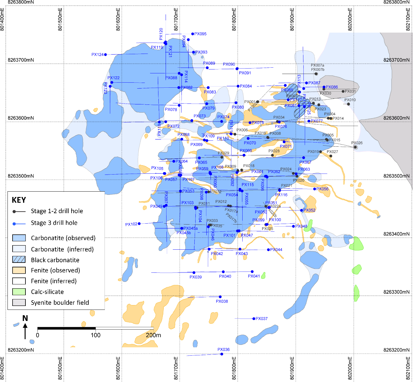 About thirty-six of the Phase 3 drill holes were step-out holes, most of which contained mineralised intersections although not all reached their targeted depths. These holes have resulted in expansion of the estimated Mineral Resources by identifying new areas of mineralised carbonatite beyond the limits of the previous exploration programmes.