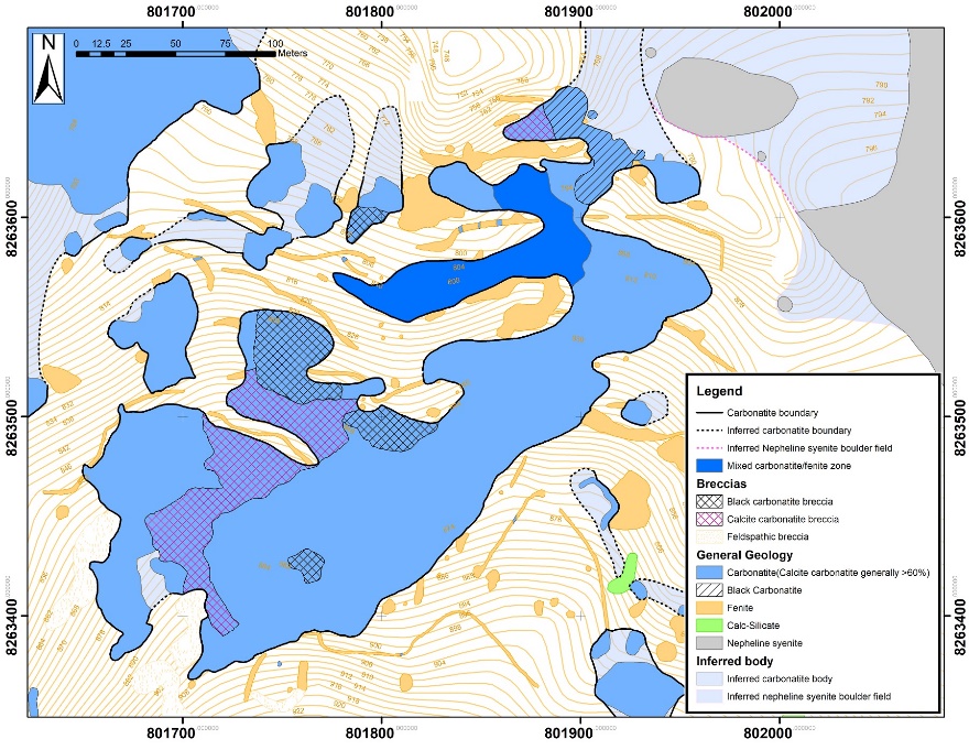 The rare earth element (REE) mineralisation occurs in the carbonatites, fenites and breccias. It is untested to the northeast and southwest beyond the limits of the present drilling and below the deepest vertical intersection of approximately 360m below the surface of the hill. The mineralised body is interpreted to be a carbonatite plug of which the central core has steep to subvertical margins.