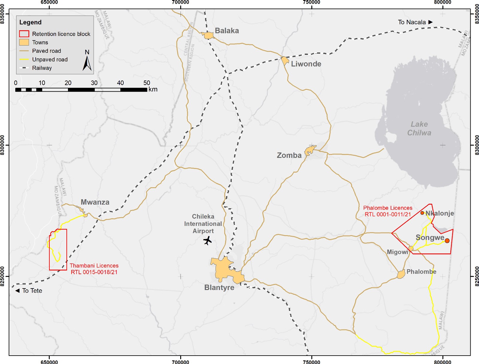 Songwe Hill is located in south-eastern Malawi, between Lake Chilwa and the Mulanje Massif, approximately 70km from the former capital Zomba and approximately 90km from the commercial centre of Blantyre, which has an international airport and a railhead. Paved roads run from the urban centres to within 12km of Songwe Hill. Secondary gravel and dirt roads provide vehicle access to the exploration camp, with recently upgraded bridges capable of taking 20-tonne trucks.