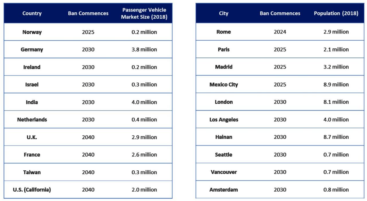 An ever growing list of countries and cities have announced impending bans on sales or use of gasoline-and diesel-powered vehicles (Source. Adamas Intelligence)