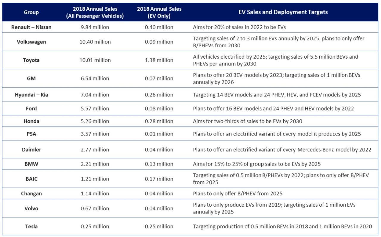 In response to ambitious government policy and the growing list of nations planning to ban sales of gasoline- and diesel-powered vehicles, virtually all the world’s leading automakers have announced equally ambitious electric vehicle production, sales, and deployment targets. For example, Volkswagen is targeting sales of 2 to 3 million electric vehicles per annum by 2025 and plans to only manufacture BEVs and PHEVs from 2030 on. Similarly, Toyota plans to electrify its entire vehicle lineup by 2025 and is targeting sales of 5.5 million BEVs and PHEVs annually by 2030 – an amount equal to roughly half the company’s global sales in 2018. The ambitious targets listed in the table below speak to an industry on the precipice of rapid change. If just a fraction of the automakers listed here successfully realize their near-term aspirations, global electric vehicle deployment will accelerate well beyond the Paris Agreement target by 2030.