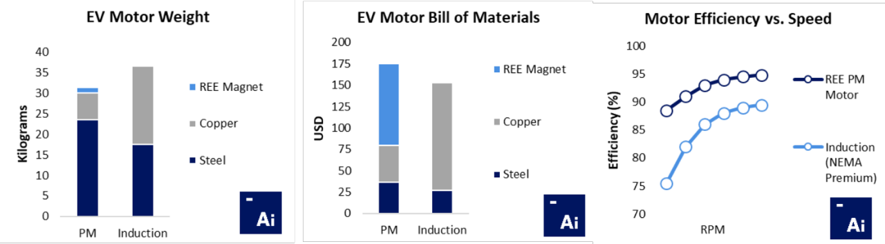 Permanent magnet traction motors are up to 15% more efficient than induction motors and are the most power-dense type of traction motor commercially available (in terms of kW/kg and kW/cm3). Despite generally having a higher bill-of-materials than incumbent traction motor types, such as induction, use of a permanent magnet traction motor is substantially more economically attractive from an automaker’s perspective because its high efficiency enables thrifting of costly battery capacity (in kWh) without compromising vehicle range (distance driven per charge).