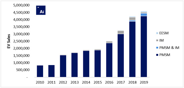 In 2019, 97% of all passenger EVs sold globally used PM motors, an increase of 3% over the year prior according to a model-by-model build-up using Adamas Intelligence’s “EV Motor Power Monthly” report and data service.