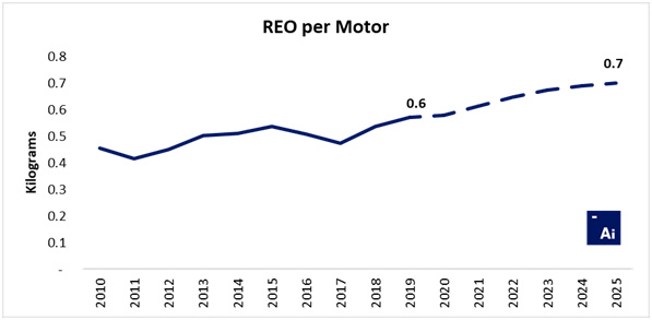 In 2019, Adamas research indicates that globally, the sales-weighted-average EV’s traction motor power totaled 93 kW, almost double what it was in 2010. Looking forward to 2025, Adamas forecasts that, as BEV sales growth continues to outpace PHEV and HEV sales growth globally, the sales-weighted-average motor power will increase to 127 kW in 2025, creating demand for 0.7 kilograms of NdPr oxide (and minor Dy/Tb) for every new EV equipped with a PMSM traction motor.