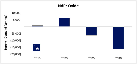 Adamas Intelligence projects that in the next decade, rapid demand growth will challenge the ability of the supply-side to keep up, particularly for neodymium, praseodymium and dysprosium, with global annual demand for these elements expected to increasingly exceed global annual production from 2022 onward, resulting in the depletion of historically-accumulated inventories and, ultimately, shortages unless substantial new sources of supply are developed.