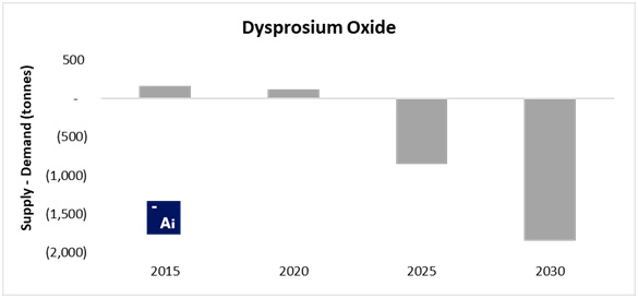 Similarly, from 2019 through 2030 Adamas Intelligence forecasts that global annual demand for dysprosium oxide (or oxide equivalent) will increasingly exceed global annual production, resulting in the depletion of historically-accumulated inventories and, ultimately, shortages of dysprosium if global production is not increased beyond what is currently forecasted.